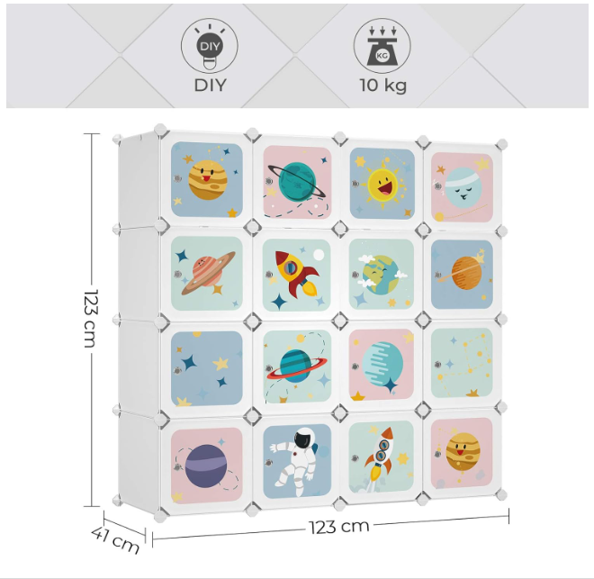 Sadržaj kutije: Ormar s uzorcima u svemirskom motivu, 16 prostranih kocki, svaka dimenzija 30 x 40 x 30 cm; ukrasite dječju sobu, hodnik ili dječju sobu ovim praktičnim komadom namještaja.