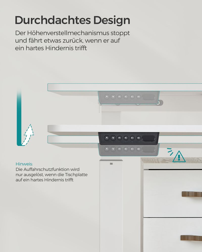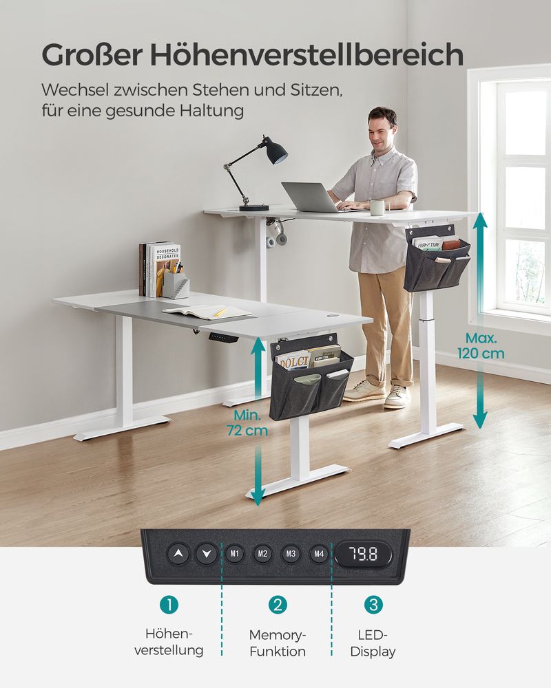 [4 memorijska dugmeta i sistem protiv sudara] Možete podesiti visinu električnog stola između 72 i 120 cm i sačuvati 4 željene visine. Također ima sistem protiv sudara.