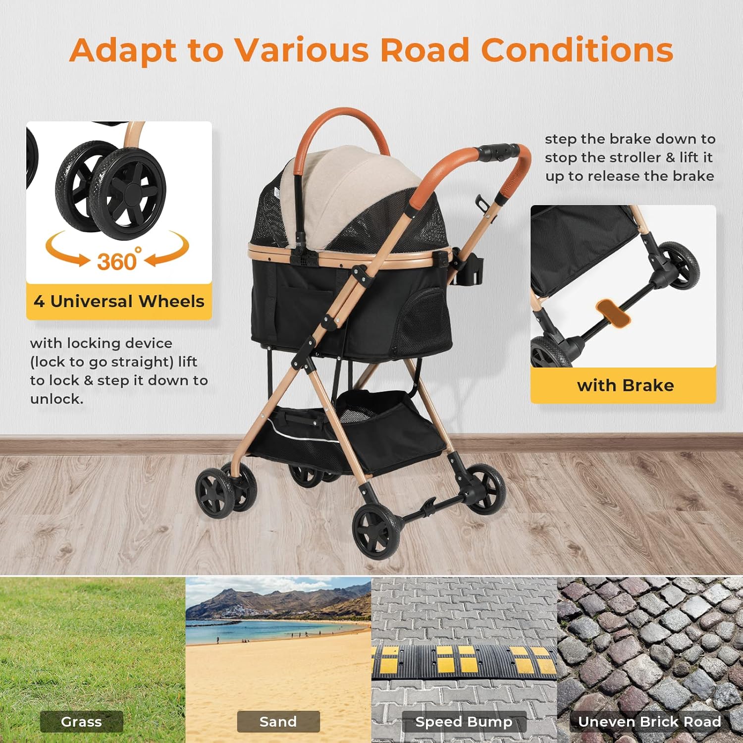【Praktični dizajn】 Prednji kotači se mogu okretati za 360° kako bi se prilagodili različitim terenima, a mogu se i zaključati za vožnju ravno. Pritisnite zadnju kočnicu da biste zaustavili kolica, sprječavajući inercijalno klizanje, praktično i sigurno. Uklonjiva obloga za jednostavno čišćenje. Držač za čaše može se koristiti za držanje boce s vodom. Bočni džepovi pružaju privremeno odlaganje vašeg telefona. Korpa za odlaganje može se koristiti za odlaganje ključeva, igračaka, grickalica i još mnogo toga.