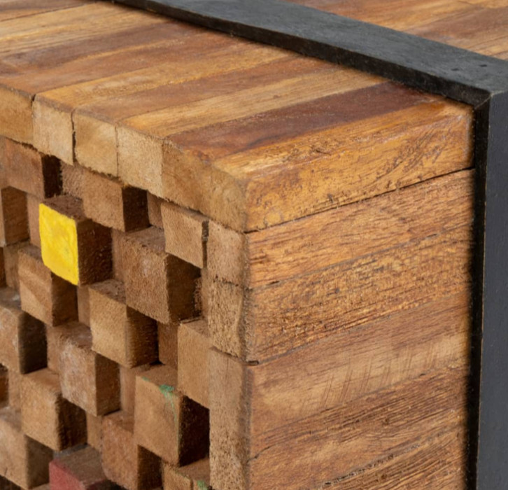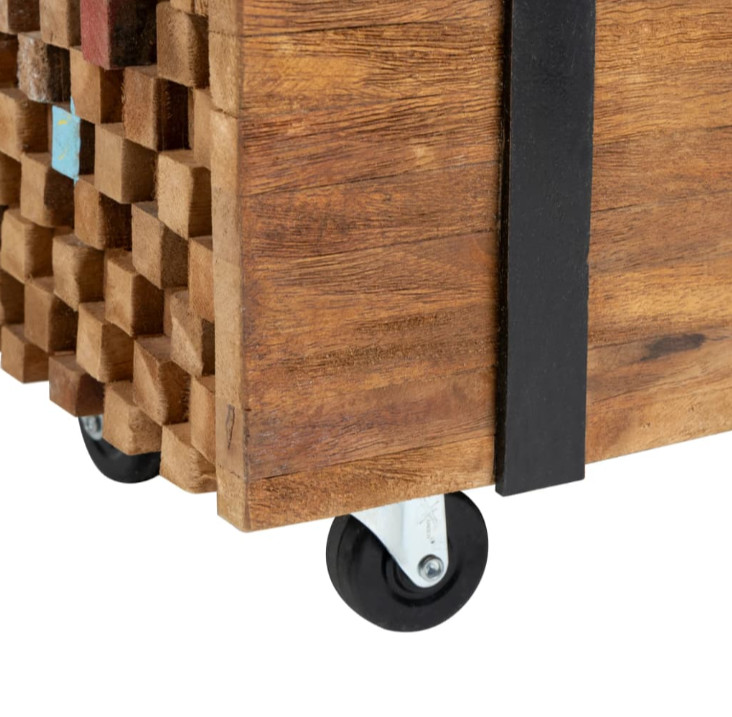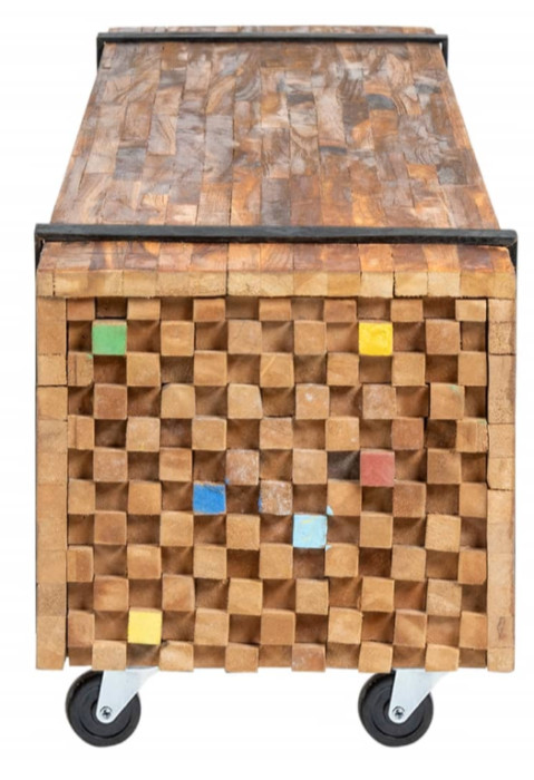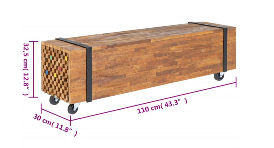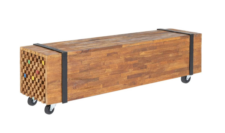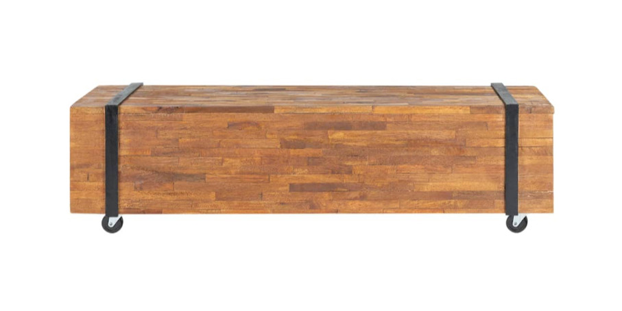 Ovaj čvrsti TV stalak izrađen je od tikovine kako bi podsjećao na hrpu greda spojenih parom crnih traka. Njegov čvrsti vrh ima dovoljno mjesta za vaš TV ili vaze, biljke u saksiji, košare s voćem i druge ukrasne predmete. Prirodna završna obrada čini TV stalak lakim za čišćenje. Zahvaljujući četiri kotača, lako se pomiče.