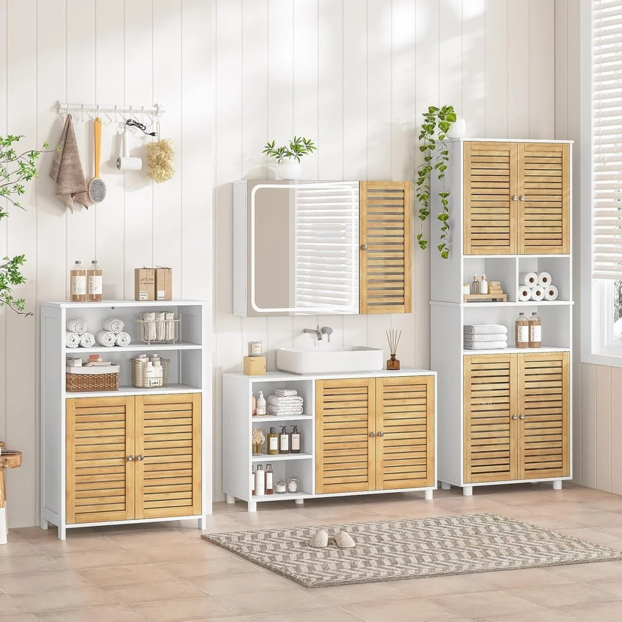 Ormarić štedi prostor i idealan je za mala kupatila. Bambus u kombinaciji s bijelim panelima daje prirodan i moderan izgled, a uz to dolazi s zaštitom protiv prevrtanja, što ga čini sigurnim i za domove s djecom ili starijima