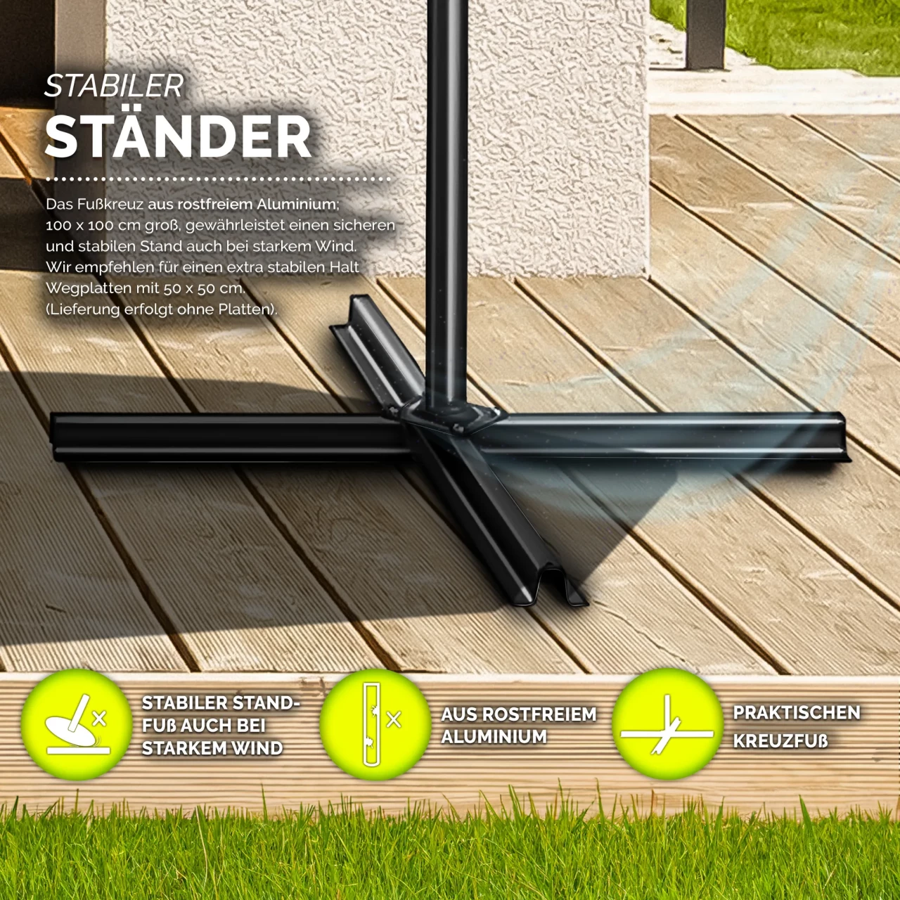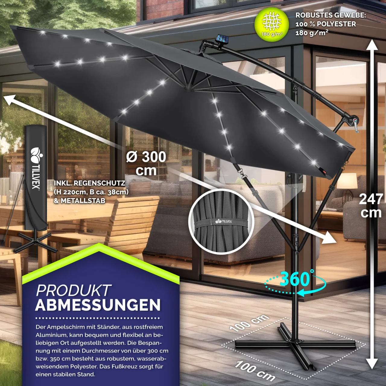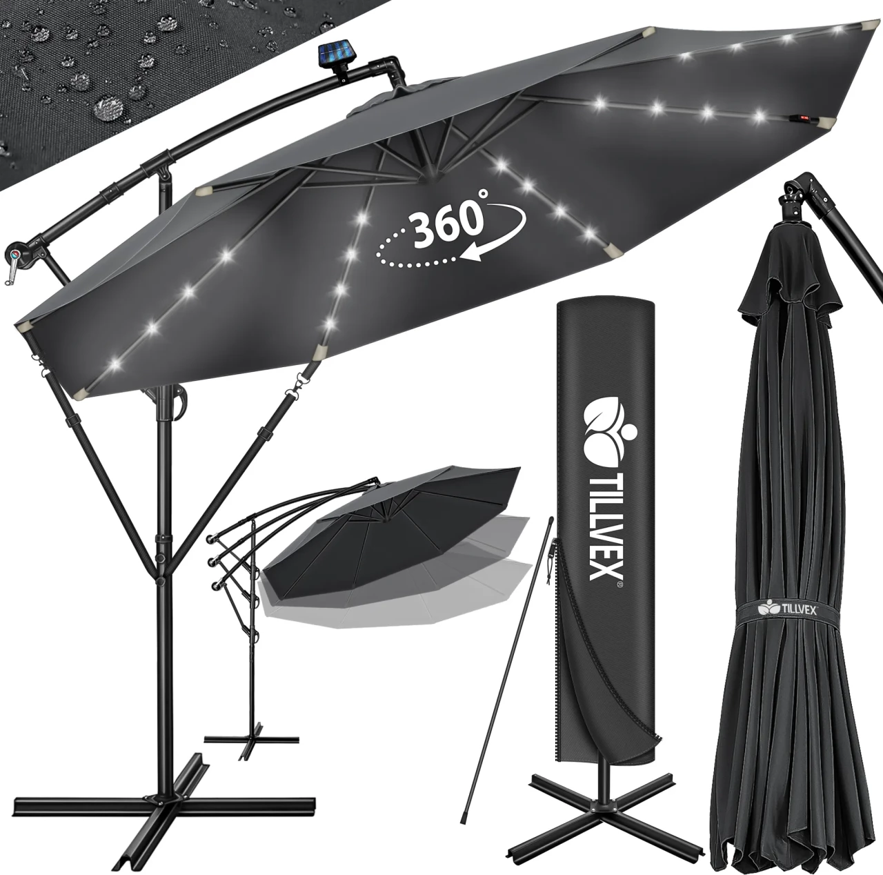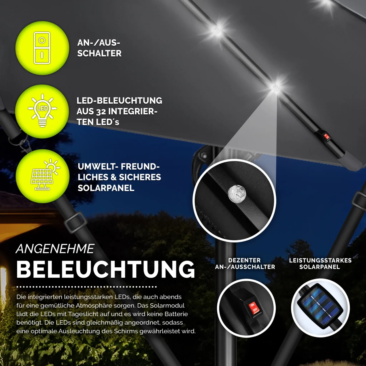 Ovaj veliki viseći suncobran (ampelschirm) pruža savršenu zaštitu od sunca i blagog nevremena na terasi, balkonu ili u bašti. Radi na solarnu energiju i ima 32 LED svjetla koja rade na prekidač, idealna su za prijatne večeri napolju — stvara atmosferu bez potrebe za vanjskim napajanjem. Može se paliti i gasiti, a njegova struktura omogućava podešavanje nagiba i rotaciju od 360°, pa sjena uvijek bude tamo gdje je potrebna.