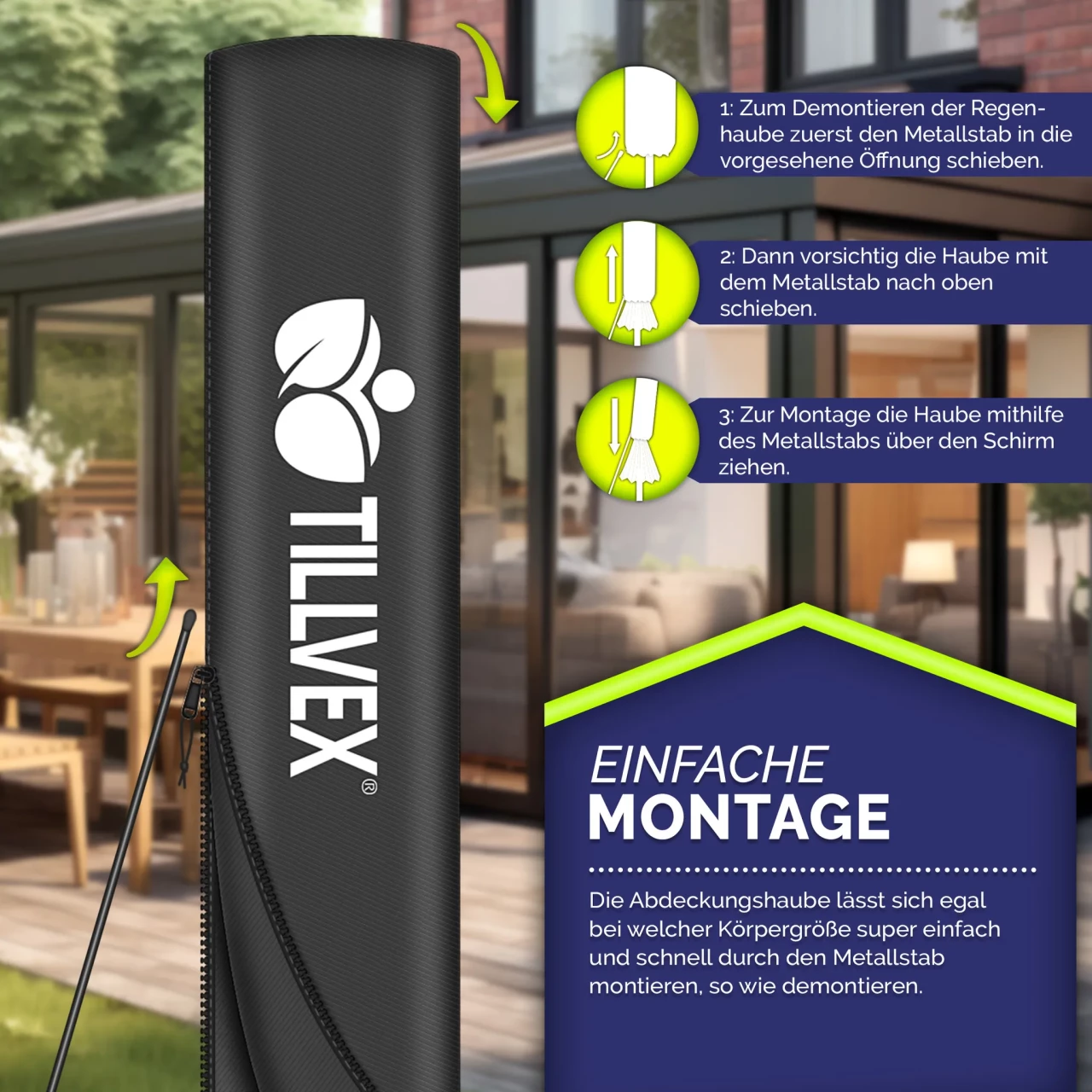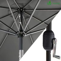 Izrađen je od izdržljivog aluminijskog stalka koji ne rđa, a tkanina krova je poliester gustine 180 g/m², vodoodbojna i sa UV-zaštitom “50+”. Šest rebara daje stabilnost, a baza-postolje je široko da podrži suncobran stabilno na vjetru. Koristi se ručna kurbla za otvaranje i zatvaranje — jednostavno, bez muke.