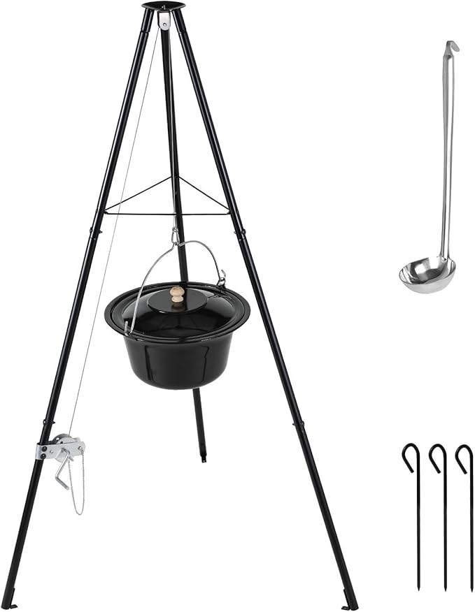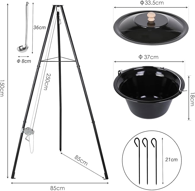 Veliki kapacitet: 1 x emajlirana posuda za pečenje govedine od 10 l, 1 x kašika (8 x 8 x 36 cm), 1 x stalak za tronožac (84 x 84 x 151 cm), 1 x lanac (2,5 m), 1 rotirajući valjak, 1 x rotirajuća ručka, 3 x šiljka za brušenu zemlju.