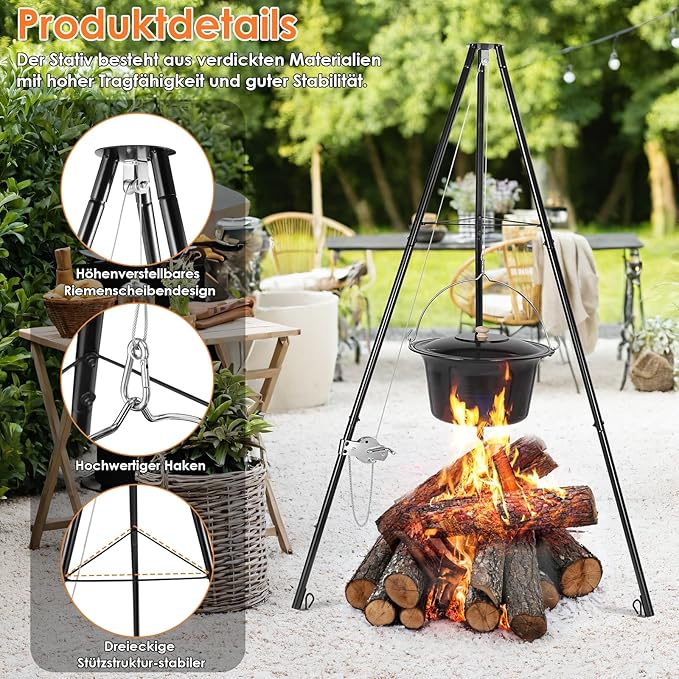 Jednostavno postavljanje i čvrstoća: Emajlirani lonac sa tronošcem dolazi s detaljnim ilustriranim uputama za montažu i alatima, što montažu i demontažu čini vrlo jednostavnom, a procjenjuje se da će montažu obaviti dvije osobe u roku od 10 minuta. Dodatna trokutasta potporna konstrukcija pričvršćena je na vrh tronošca s kotlom kako bi proizvod bio stabilniji.