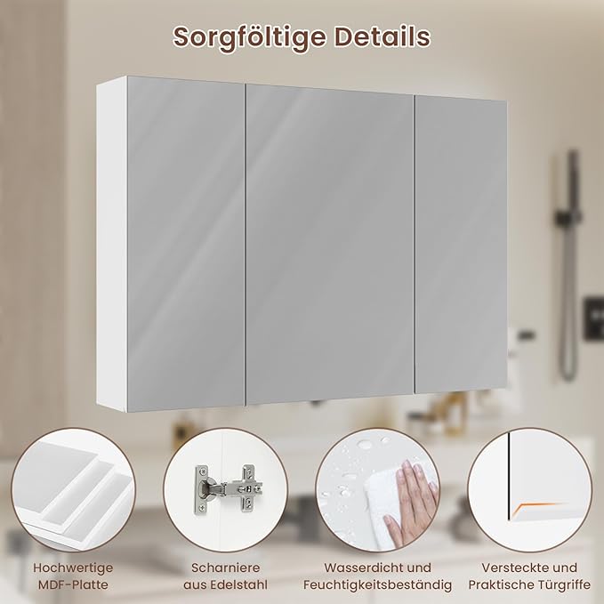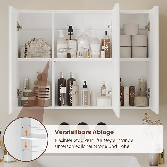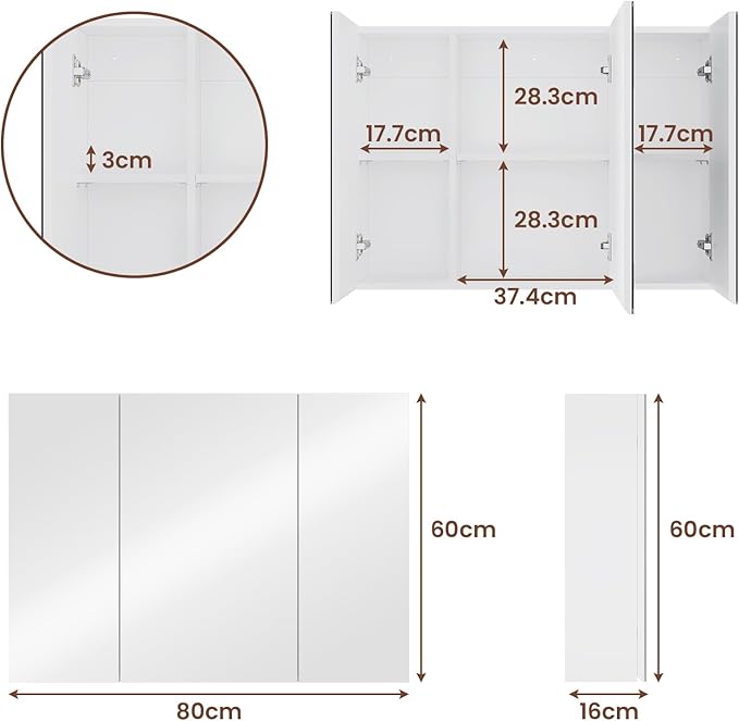 Elegantno i praktično: jednostavan, ravan dizajn i visokosjajna, bijela površina u kombinaciji s troja vrata s ogledalom bez okvira daju ovom ormariću za odlaganje dimenzija 80 x 60 x 16 cm elegantan i moderan dodir te čine da kupaonice izgledaju prostrano i svijetlo. Zidni ormarići mogu se kombinirati s bilo kojim stilom uređenja i savršeno se koriste u kupaonici, kuhinji, dnevnoj sobi, spavaćoj sobi, ulaznom prostoru itd.