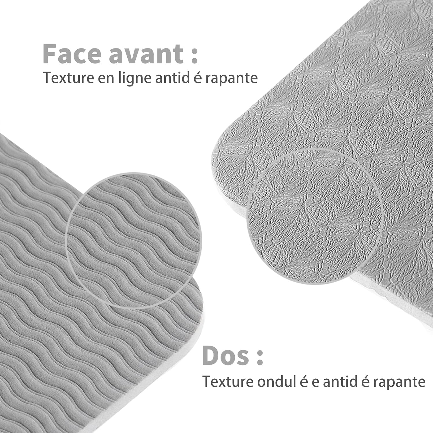 Neklizajuća površina: Dvoslojna struktura osigurava neklizajuću površinu s obje strane. Prednja strana je opremljena linijskom strukturom protiv klizanja, a stražnja strana valovitom strukturom protiv klizanja za bolje prianjanje. Dvostruka zaštita čvrsto se naslanja na pod i pruža potporu tijelu, bilo da se radi o glatkom pločicama ili drvenom podu.