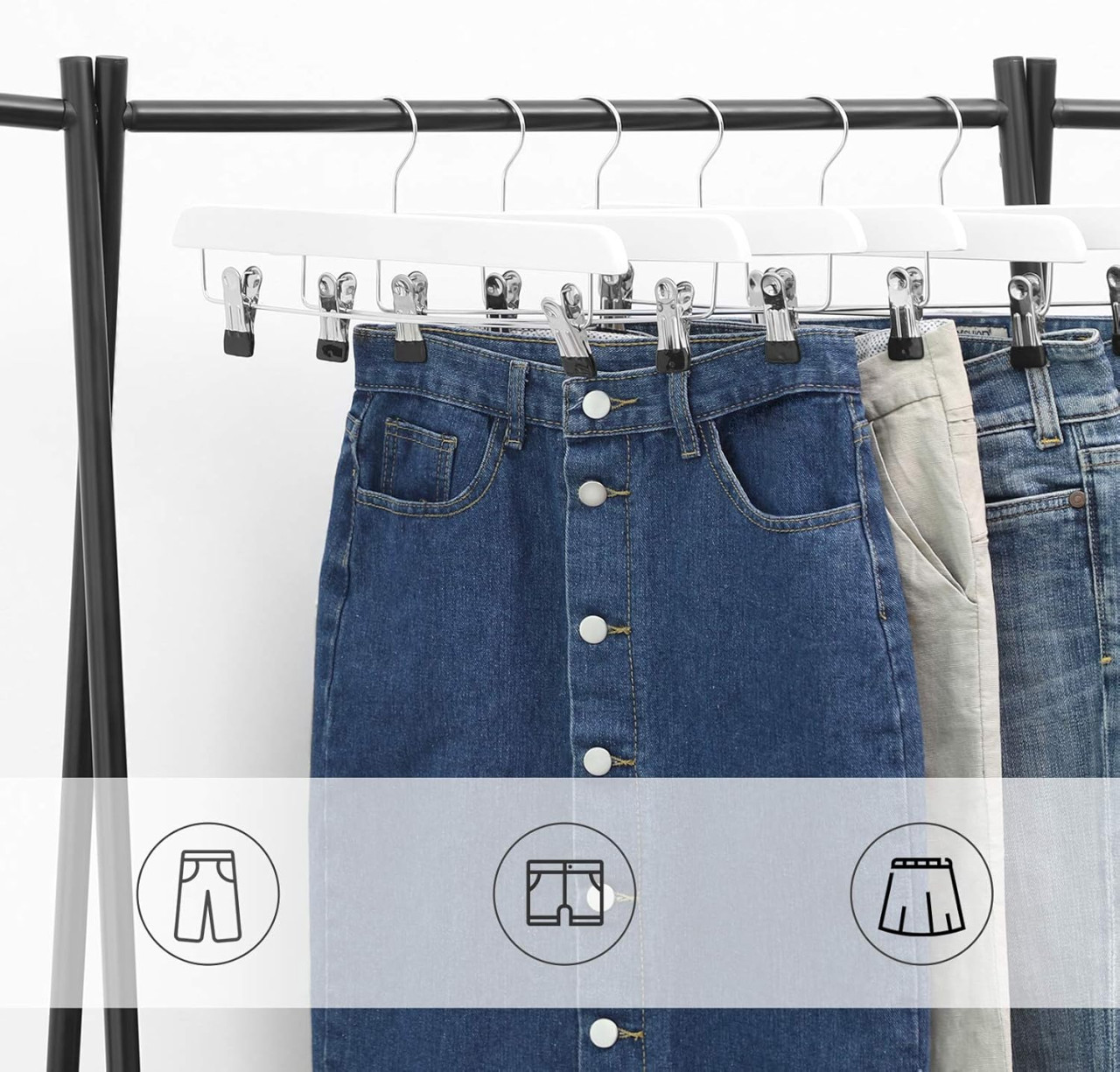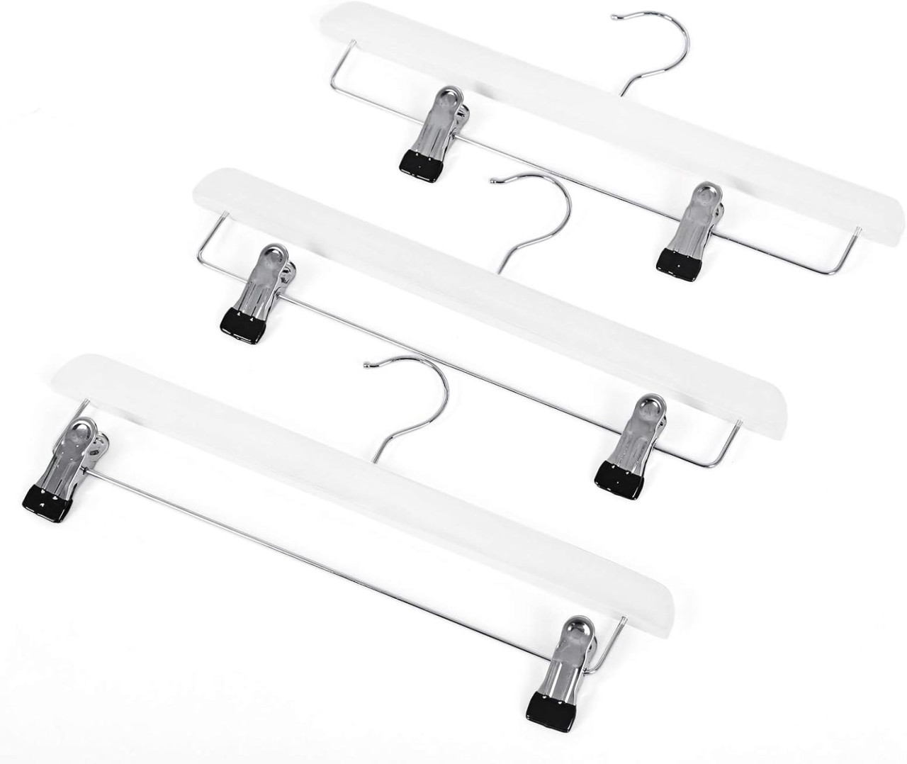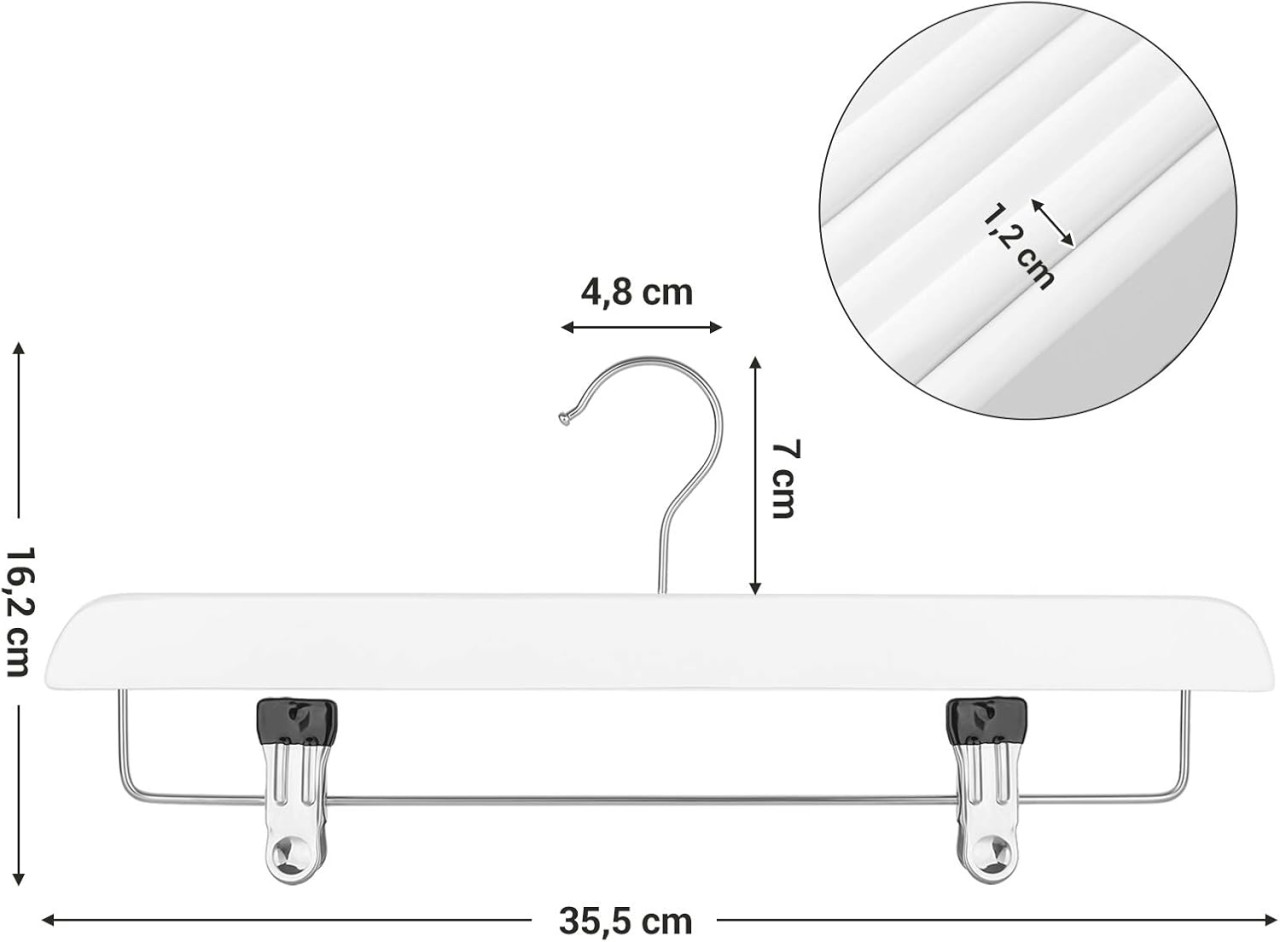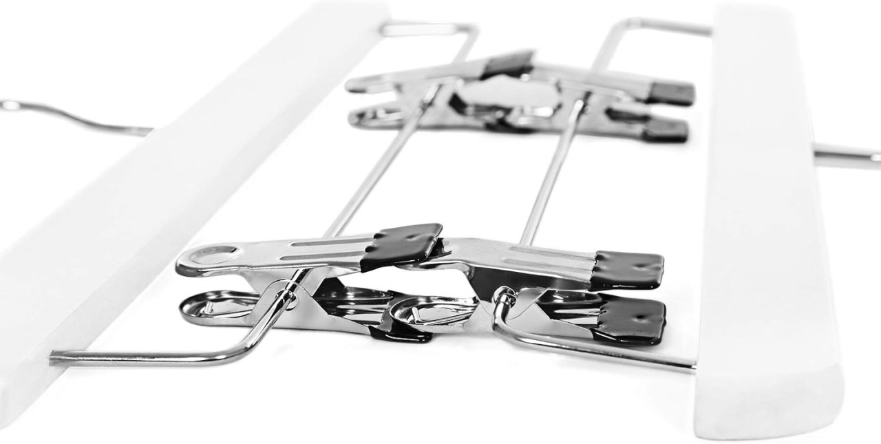 Praktičan set ofingera za suknje, hlače, šorceve i druge odjevne komade koji zahtijevaju precizno i nježno kačenje. Izrađeni su od čvrstog drveta u bijeloj boji, sa glatkom završnom obradom, i metalnim klipsama koje ne ostavljaju tragove zahvaljujući PVC sloju. Klipse su podesive po širini, pa lako možeš okačit i tanje i šire komade garderobe bez gužvanja. Na ofingerima ima i rotirajuća kuka (360°) tako da ih možeš okrenut kako ti odgovara.