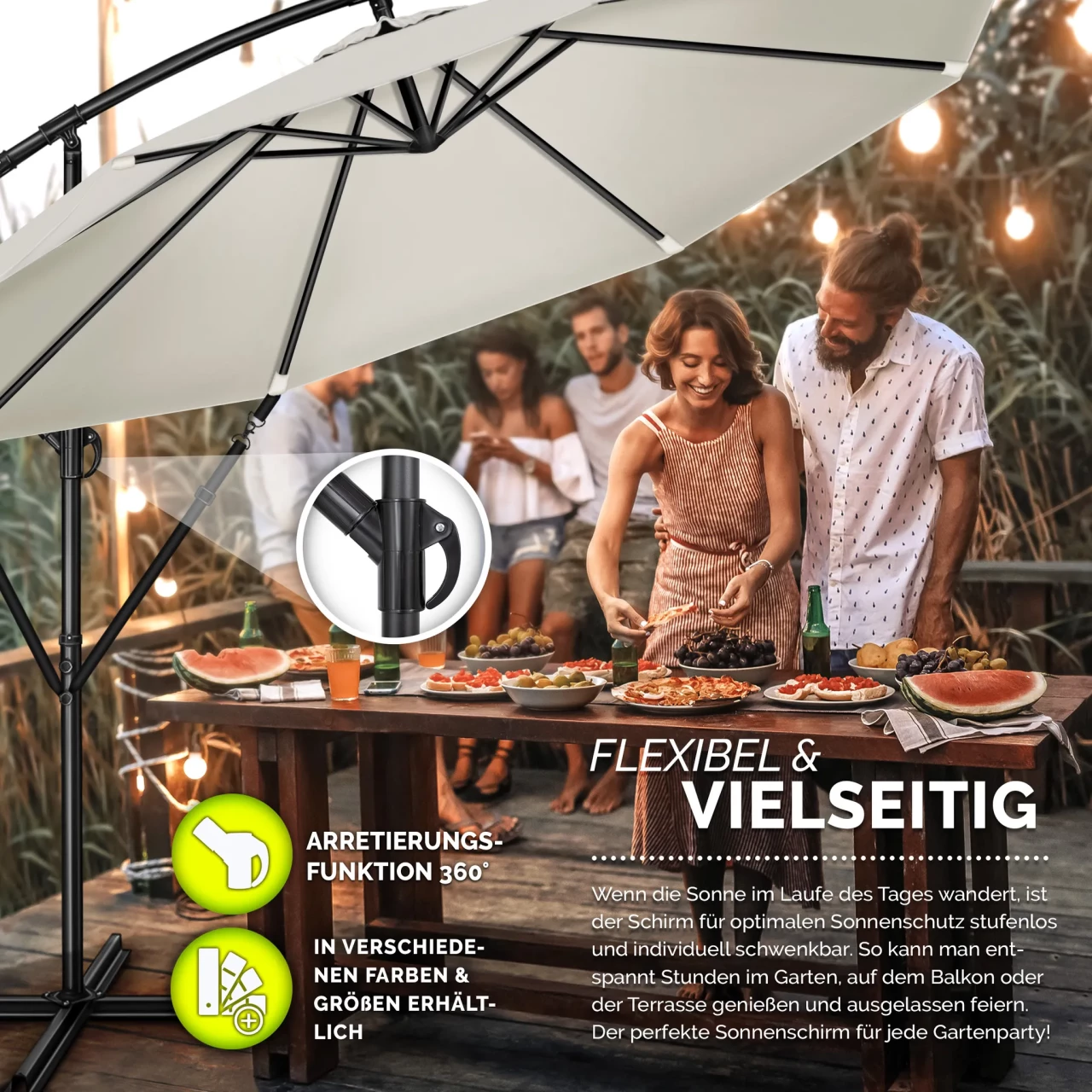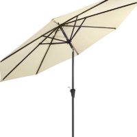 Ovaj veliki bež kišobran sa alu konstrukcijom idealan je za terase, balkone ili bašte gdje je potrebna jaka i pouzdana zaštita od sunca. Mehanizam podizanja je ručna kurbla, koja omogućava jednostavno otvaranje i gašenje. Kišobran se može naginjati (neigbar) da bi se bolje prilagodio uglu sunca, pa pruža sjenu u raznim pozicijama tokom dana.