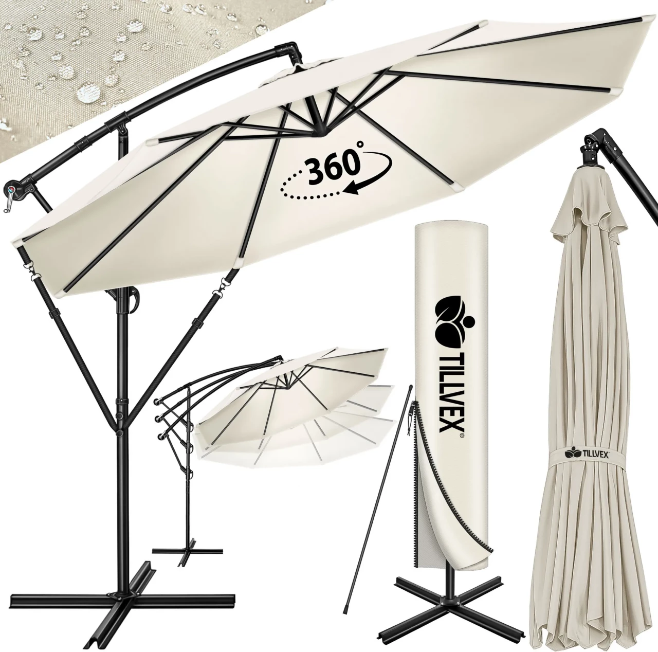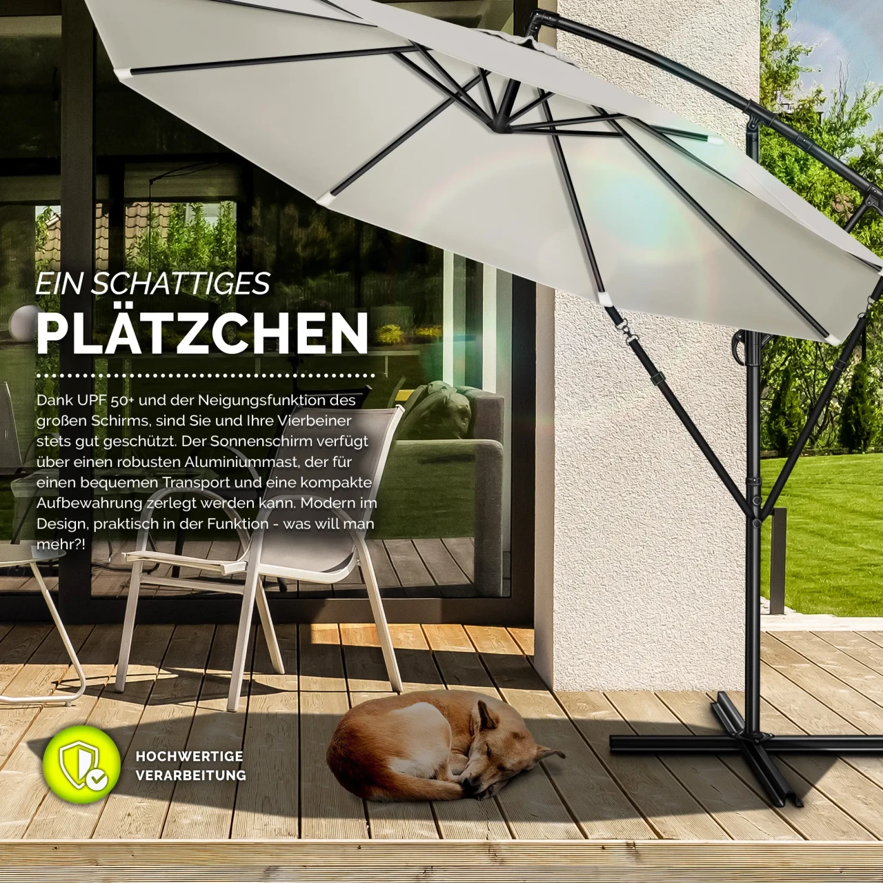 • Funkcije: stalan nagib (neigbar), UV-50+ zaštita, vodoodbojna površina, mogu se sklopiti radi skladištenja, stabilna baza s velikim profilom