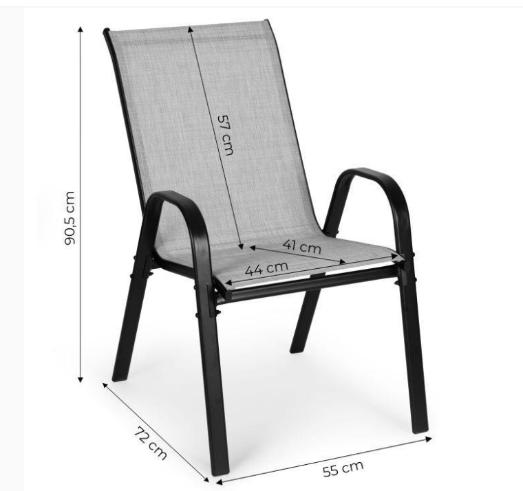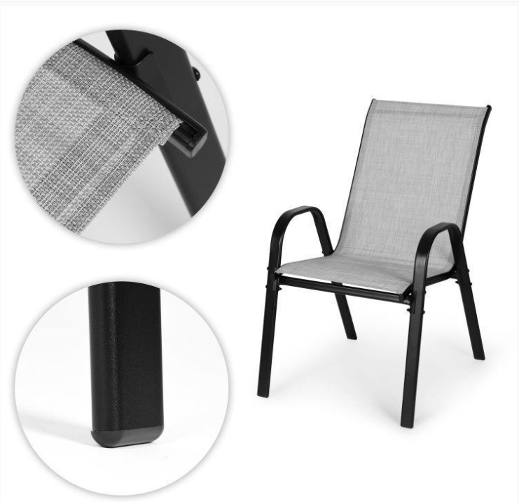 Ovaj set od 4 vrtne stolice savršeno je rješenje za bilo koji vrt, terasu ili balkon. Proizvod ima moderan oblik i univerzalne boje, što ga čini lako uklopivim u bilo koji ambijent. Stolice su izrađene od metalnog okvira s praškastim premazom koji osigurava otpornost na hrđu i tekstilne mreže koja je otporna na vremenske uvjete i vodopropusna. Udobni, oblikovani nasloni za ruke i protuklizne nožice povećavaju udobnost tijekom korištenja i štite površinu. Stolice se lako čiste i slažu se radi lakšeg skladištenja.