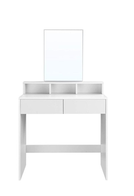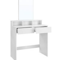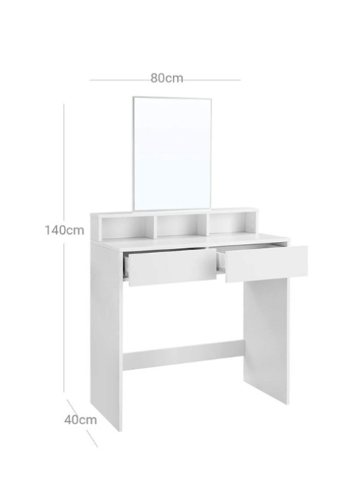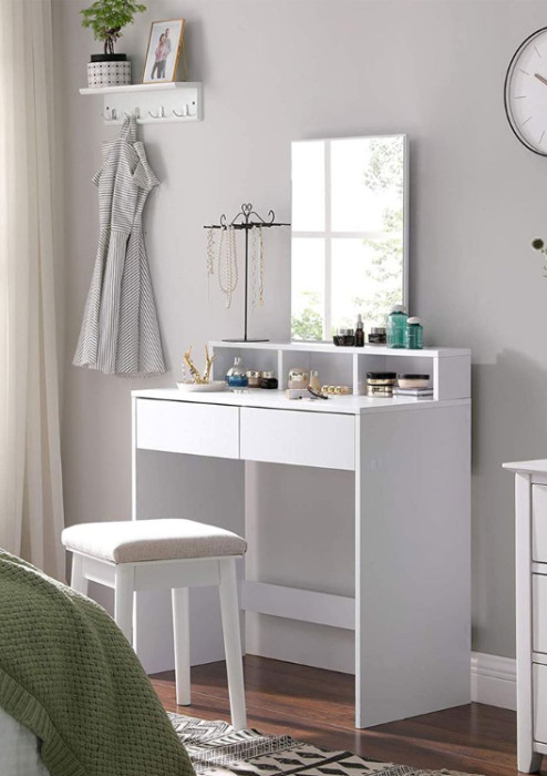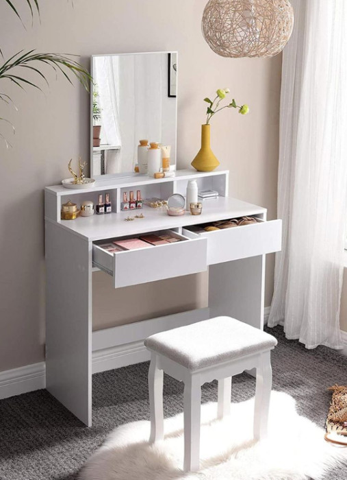 Ovaj toaletni stolić ima dvije velike ladice za sjenilo i puder u prahu, tri otvorena odjeljka za vašu kolekciju lakova za nokte i povišenu policu za bočice parfema.