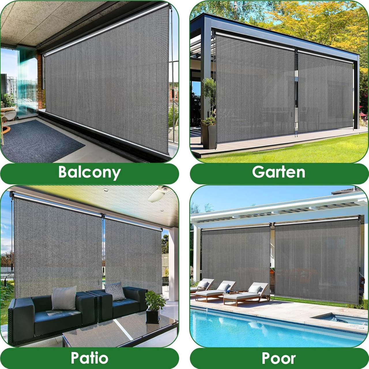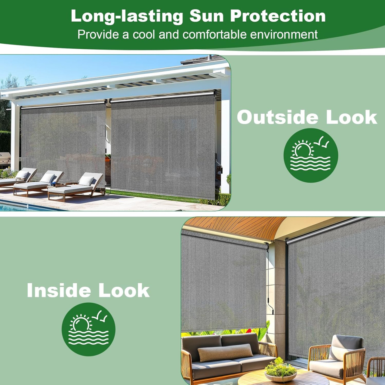 Dizajnirano je da blokira sunce, smanji toplinu i pridonese komforu tijekom vrućih dana. Konstrukcija je otporna i stabilna, a alat za montažu dolazi uz proizvod. Jednostavno se montira, koristi i održava, što ga čini praktičnim dodatkom za vanjske prostore.