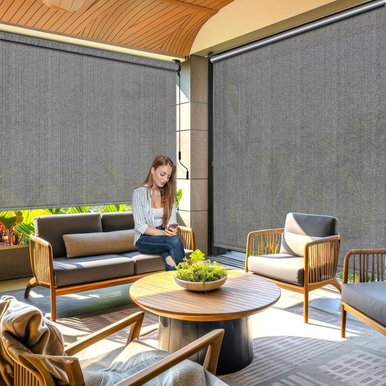 Ovo rolo sjenilo je idealno za zaštitu od sunca na terasama, balkonu ili pergoli. Ima aluminijski tubus i sistem navijanja manivelom bez sajle (“cordless crank”), što znači da se ručno, ali uredno i bez zapetljanja, može spuštati i podizati sjenilo. Tkanina je HDPE (visoko-denzitetski polietilen), koja propušta zrake sunca, ali pruža i određenu zaštitu od UV zraka i osigurava prozračnost.