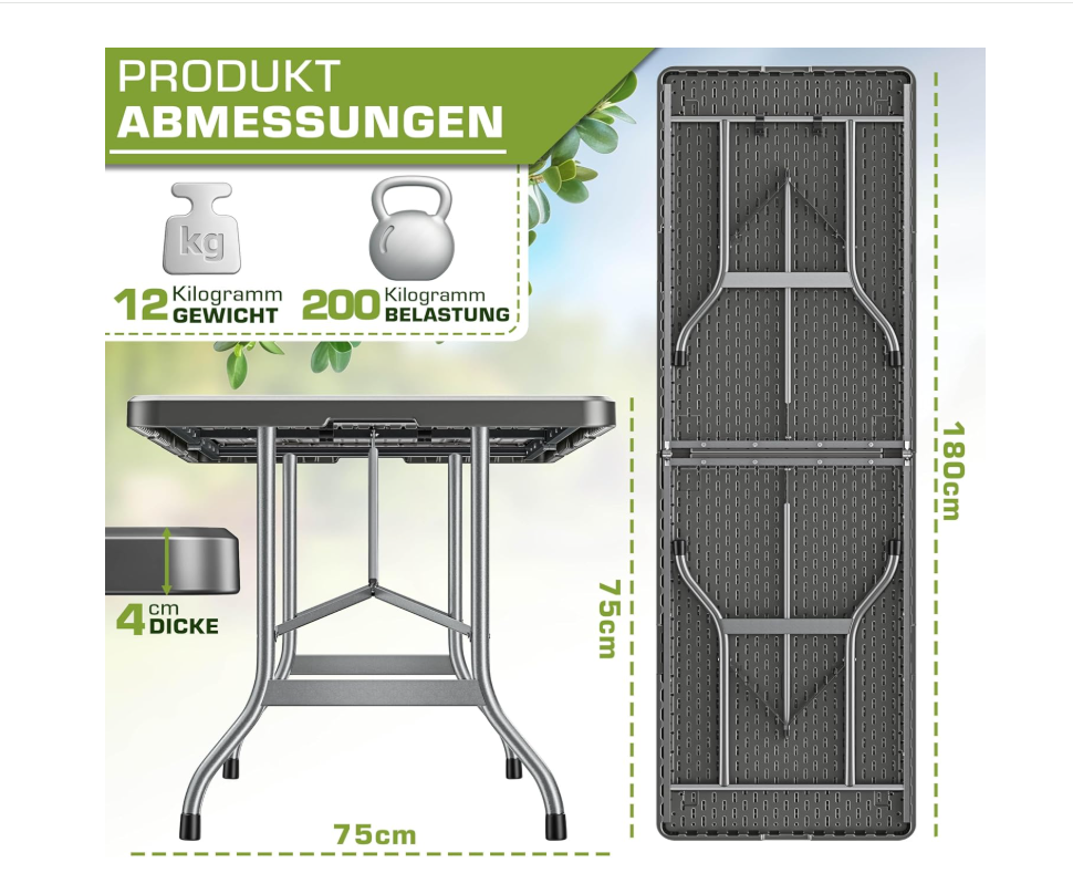 Tehnički podaci: Dimenzije (D x Š x V): 180 x 75 x 74 cm | Materijal ploče stola: plastika otporna na vremenske uvjete | Materijal okvira: čelik