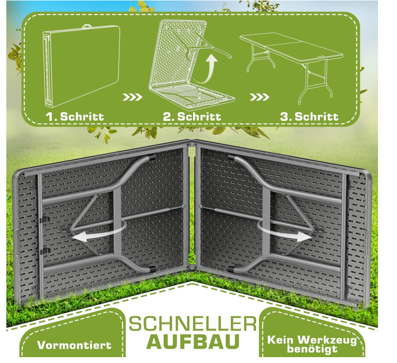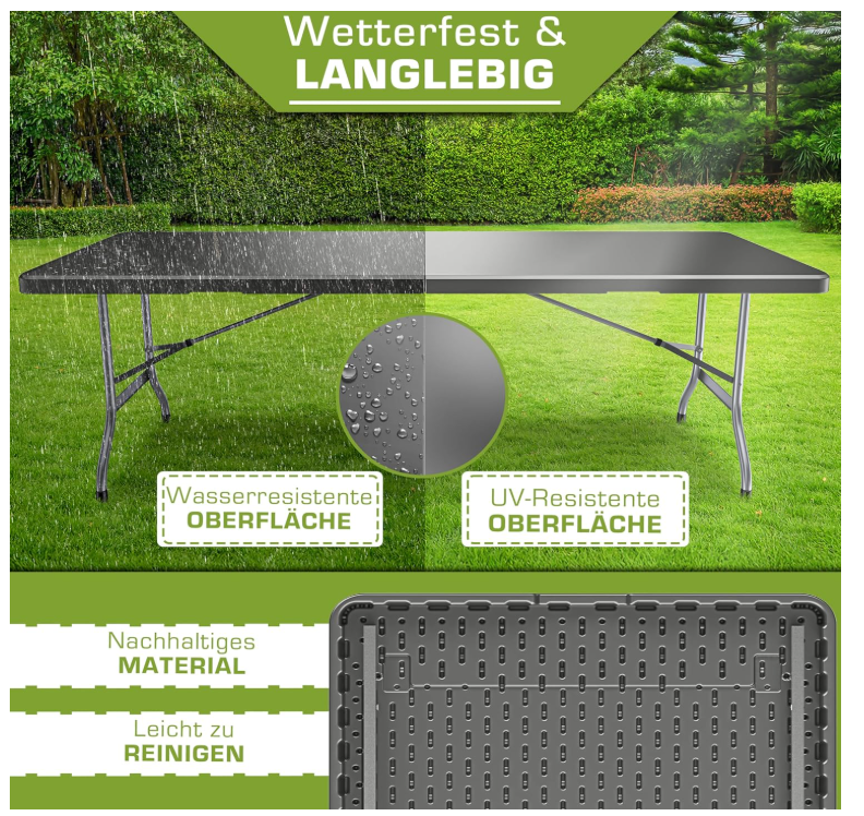 Vrlo robustan i visokokvalitetan: plastika otporna na vremenske uvjete, robusni čelični okvir i protuklizne nožice daju stolu za kampiranje stabilno držanje. Ploča stola je proizvedena ekstra široka, tako da stol može izdržati do 200 kg.