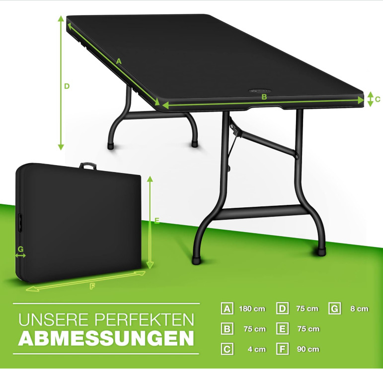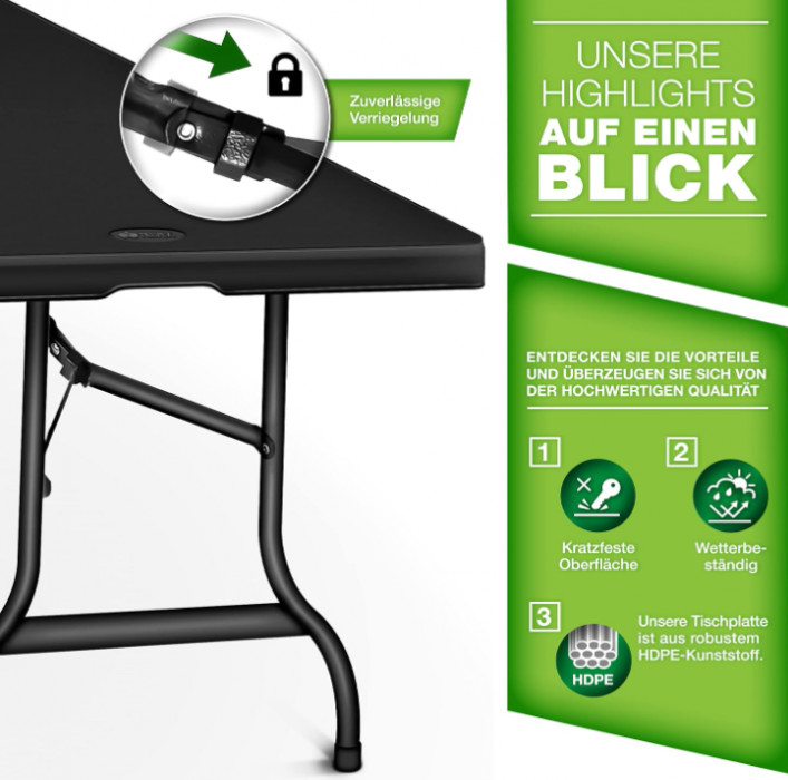 Svestran: idealan sklopivi stol za korištenje u vrtu, kampiranju, kuhinji, balkonu, terasi ili na događaju. Moderan plastični izgled daje stolu za bife moderan dizajn koji se uklapa u svaku prostoriju. Vrlo robustan i visokokvalitetan: plastika otporna na vremenske uvjete, robusni čelični okvir i protuklizne nožice pružaju stolu za kampiranje stabilan hvat. Ploča stola proizvedena je ekstra široka, tako da stol može izdržati do 200 kg. Praktični sklopivi stol: savršen kao blagovaonski stol, koristan stol za bife za sljedeću vrtnu zabavu, rođendan, buvljak ili za kampiranje (u zatvorenom i na otvorenom).